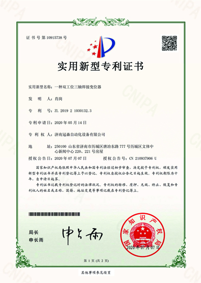 實(shí)用新型專(zhuān)利證書(shū) 一種雙工位三軸焊接變位器