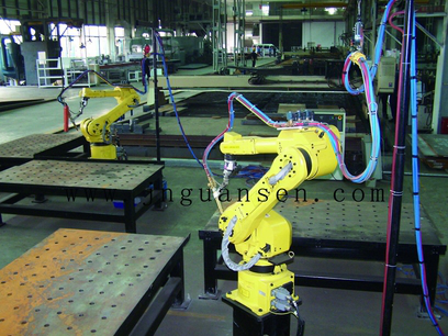 該工作站由工業(yè)機(jī)器人、機(jī)器人直線行走滑臺(tái)、柔性工裝夾具、氣體調(diào)節(jié)柜、割據(jù)、氣閥、點(diǎn)火閥及其它輔助 設(shè)備和外圍安全防護(hù)網(wǎng)等部分組成。該工作站具有可長(zhǎng)期進(jìn)行切割作業(yè)、保證切割作業(yè)的高生產(chǎn)率、高質(zhì)量和 高穩(wěn)定性等特點(diǎn)。